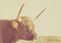 Zijprofiel van een hooglandkoe, met lang haar op haar hoofd en hoorns, tegen een bleke achtergrond. De afbeelding heeft zachte tinten, een vintage stijl en een korrelige textuur met een sepiatint. In de verte is een onscherp landschap met natuurlijke verlichting en zachte schaduwen. De kleuren zijn neutraal en de bonttexturen zijn gedetailleerd, met een kleine scherptediepte.