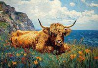Olieverfschilderij van een hooglandkoe liggend in het gras met kustkliffen, bloemen en de zee op de achtergrond op een zonnige dag