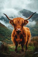 Een majestueus hoogland rund staat midden in een dramatisch, mistig landschap. Met zijn lange, ruige, roodachtige vacht en imposante, gebogen horens straalt hij een rustieke kracht uit. De zachte, nieuwsgierige ogen lijken verhalen te vertellen van vervlogen tijden, terwijl de wind door de groene omgeving waait en het beeld tot leven brengt.