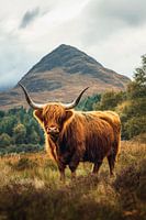 Met majestueuze, gebogen horens troont een Highland-koe in het ruige Schotse landschap. Zijn diepbruine vacht gloeit in het zachte licht, terwijl op de achtergrond de imposante berg afsteekt tegen de bewolkte lucht. Een harmonieuze scène van natuur en dier, die tegelijkertijd kracht en gratie belichaamt.