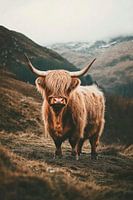 Een Highland koe zit majestueus in de mistige Highlands, zijn vloeiende gouden vacht in contrast met het ruige landschap. De imposante, gebogen horens geven hem een krachtige uitdrukking, terwijl de zachte, intelligente ogen een onverwachte zachtheid uitstralen. Een fascinerend wezen dat zowel de wildheid als de gratie van de natuur…