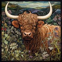 Het portret van een Schotse Hooglander. Het imposante dier staat in een veld met bloeiende bloemen, een prachtig zomers dierenportret.