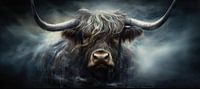 Hooglander | Zwart - Het kunstwerk toont een krachtige weergave van een Schotse Hooglander, wiens indringende blik en ruige textuur van de vacht centraal staan. De kunstenaar speelt met het contrast tussen de diepzwarte en grijze tonen van de achtergrond en de warme, bruine kleur van het dier, waardoor er een bijna dromerige, maar tegelijkertijd stoere sfeer ontstaat.