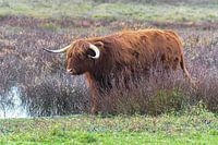 Hooglander loopt langs de oever bij de wei van Brasser, in het Noordhollands duinreservaat in Castricum aan Zee.