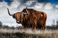 Dit rund is een indrukwekkende Schotse Hooglander, een ras dat bekendstaat om zijn robuuste uiterlijk. De vacht van het dier is lang en ruig, met een warme roodbruine kleur die varieert in tint, waardoor er een natuurlijke, levendige textuur ontstaat. De hoorns, groot en majestueus, hebben een lichtere grijstint met donkere uiteinden, wat een scherp contrast vormt met de kleuren van de vacht.