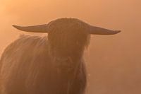 Portret van een Schotse hooglander. De hooglander staat in de mist, welke mooi oranje kleurt door de opkomende zon.