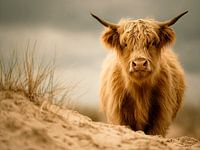 Op de foto staat een hooglander in het zand, gefotografeerd van voren en iets van onderaf. Zijn vacht is lang, warrig en lichtbruin van kleur. De kop is iets gekanteld, de blik is recht en rustig. Rechts in beeld domineert het dier, links is een glooiing van zand met helmgras zichtbaar. De horizon vervaagt in…