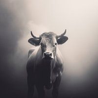 Met een dromerige achtergrond die de koe in mysterie hullt, creëert deze foto een gevoel van nieuwsgierigheid. Het zou een uitstekende aanvulling zijn op een thuiskantoor of een bibliotheek.