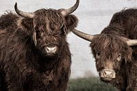 2 exemplaren hooglanders ( runderen) samen in de wei.
