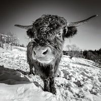 Zwart-wit portret van een hoogland rund in de sneeuw