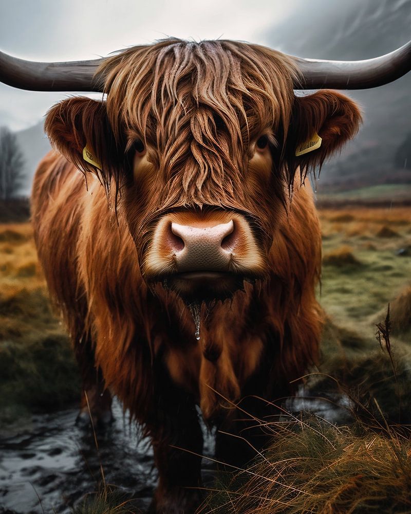 Hooglanders zijn nieuwsgierig naar de camera in mystieke sfeer