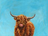 Hooglandkoe met krullen is een handgemaakt acrylschilderij van kunstenaar Karen Kaspar.