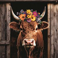 Hoogland, Koe, Bloemenkrans, Stal, Hoorns, Roodbruin, Zonnebloemen, Portret, Vee, Hout, Dieren, Boerderij, Schuur, Bloesem, Geel, Oranje, Roze, Paars, Rustiek, Landleven, Natuur, Decoratie, Koper, Bont, Vee, Landelijk, Zomer, Gezellig, Pastoraal, Traditie