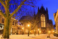 Prachtige opname van de Hooglandsekerk in Leiden tijdens het blauwe uur in de winter gezien vanaf de Hooglandsekerkgracht