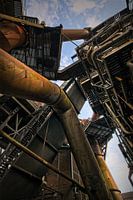 Omhoog gerichte blik op de tientallen meters hoge voormalige hoogoven in het Landschaftspark van de Duitse stad Duisburg.