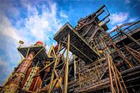 Blik op de tientallen meters hoge voormalige hoogoven in het Landschaftspark van de Duitse stad Duisburg.