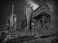 Zwart-wit opname van de industriële installaties behorend tot een voormalige hoogoven in het Landschaftspark in de Duitse stad Duisburg.