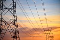 Electriviteit hoogspanningsmasten tijdens zonsondergang met stroomkabels die in de afstand verdwijnen.