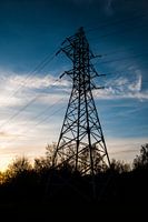 Hoogspanningsmast, weiland, Hoogspanningsmasten , stroom, elektriciteit, avond, zon, industrie sunset, zonsondergang.