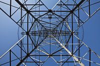 Een abstracte foto van een elektriciteitsmast, van onderaf gezien.