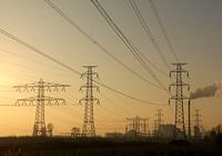 Hoogspanningsmasten in tegenlicht geven dit energie landschap een grafisch beeld