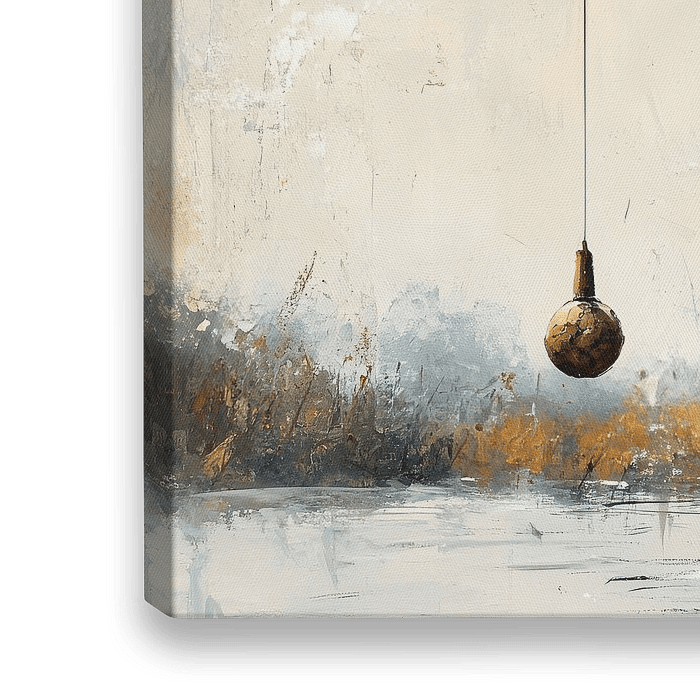 Een serene visser balanceert boven het water, gevangen in een moment van reflectie en stilte te midden van een desolate, schilderachtige omgeving.