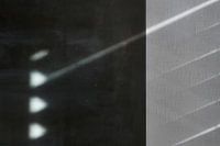 Avondzonlicht valt door de luxaflex en tovert een patroon op de muur en het abstracte schilderij. Abstracte compositie voor liefhebbers van minimalistische kunst.