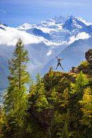 Een vrouw maakt een vreugdesprong op het hoogtepad tussen Moosalp en Jungen in het Mattertal in Wallis, Zwitserland. Op de achtergrond is de Nadelgraat met Riedgletsjer zichtbaar, die gelegen is nabij de bergdorpen Gasenried en Grächen.