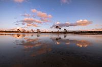 De foto toont een rustig tafereel in het natuurgebied De Loonse en Drunense Duinen. Het is middag en het water staat hoog. De bomen worden prachtig weerspiegeld in het kalme wateroppervlak.