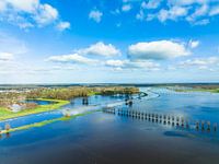 Hoge waterstand in de Vecht bij Dalfsen in het Nederlandse Vechtdal in Overijssel, Nederland. De rivier stroomt over in de uiterwaarden na hevige regenval stroomopwaarts in Nederland en Duitsland tijdens de stormen Eunice en Franklin in februari 2022.
