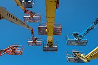 Bij een verhuurbedrijf voor hoogwerkers staan de werkbakken hoog in de lucht. De combinatie met de verschillende kleuren van de hoogwerkers en de blauwe lucht geeft een mooi wat abstract beeld.
