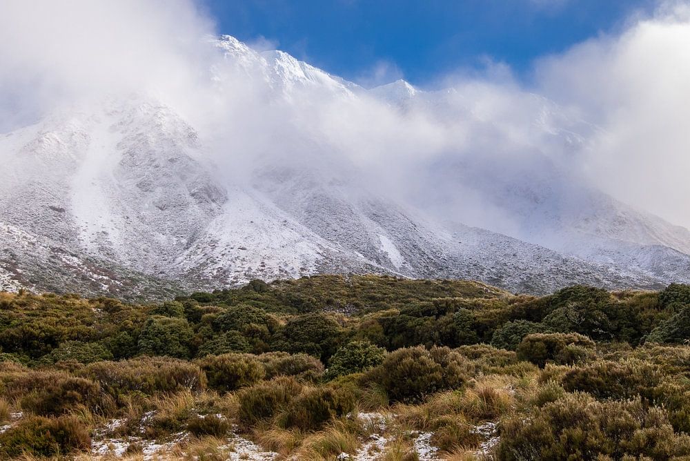 Uitzicht op besneeuwde bergen rondom Hooker Valley, de vallei die leidt naar Mount Cook op het zuidereiland in Nieuw-Zeeland.