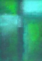 Hope is een abstract acrylschilderij in portretformaat, geschilderd door de kunstenares Karen Kaspar. Het is geschilderd in verschillende heldere tinten groen, blauw-groen en blauw en drukt hoop, geloof en liefde uit. Vage geometrische vormen vormen een kruis in dit kunstwerk. 423