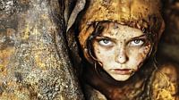 Een jong meisje, bedekt met modder en sporen van barre levensomstandigheden, verstopt zich en zoekt wanhopig naar hulp. Haar gezicht toont het lijden en de druk die oorlog en armoede op onschuldige kinderen leggen, maar er is een sprankje hoop in haar ogen dat duidt op de wil om te overleven en het verlangen naar veiligheid. Dit…