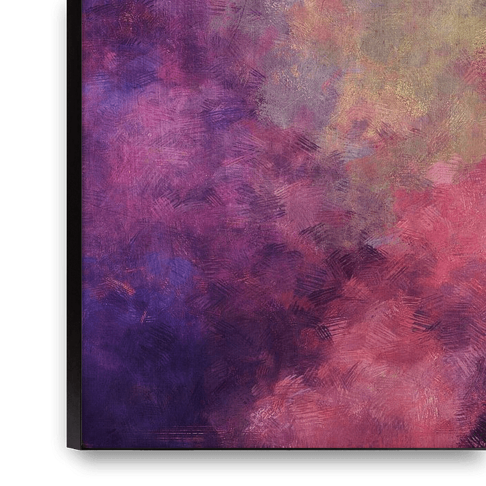 Levendige kleuren zoals roze, geel, paars en blauw komen samen in dit dromerige, abstracte werk. Penseelstreken en een lichte textuur van het doek zijn zichtbaar, waardoor een gestructureerd en gelaagd effect ontstaat, terwijl de bovenliggende wolkenfotografie de etherische, emotionele sfeer benadrukt.