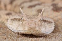 Een portret van een Hoornadder op het zand. Dit zijn dieren welke dankzij hun camouflagekleuren volledig opgaan in de omgeving.