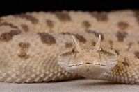Een portret van een Hoornadder op het zand. Dit zijn dieren welke dankzij hun camouflagekleuren volledig opgaan in de omgeving.