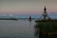 Tegen het vallen van de avond, vaart een kleine open zeilboot de haven van Hoorn binnen.