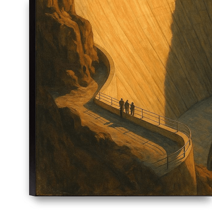 Dit majestueuze en ontzagwekkende kunstwerk vangt de enorme schaal en architectonische schoonheid van de Hoover Dam op de grens van Nevada en Arizona. De massieve, gebogen betonnen voorkant van de dam en de iconische Art Deco innametorens baden in het grimmige, gouden licht van een late namiddagzon. De omringende ruige canyonwanden zijn…