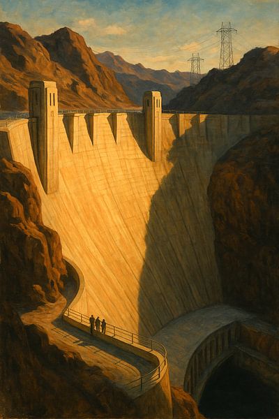 Dit majestueuze en ontzagwekkende kunstwerk vangt de enorme schaal en architectonische schoonheid van de Hoover Dam op de grens van Nevada en Arizona. De massieve, gebogen betonnen voorkant van de dam en de iconische Art Deco innametorens baden in het grimmige, gouden licht van een late namiddagzon. De omringende ruige canyonwanden zijn…