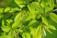 Bladeren van de hopbeuk, Ostrya, in het voorjaar