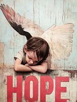 Vintage illustratie met het portret van een klein jongetje met engelenvleugels op een grove grunge textuur in pastelkleuren.