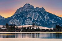 Winter en zonsopkomst over de Hopfensee, bij Hopfen am See met het Karwendelgebergte in de achtergrond, gelegen nabij Füssen, in de Allgäu, in Beieren, zuid Duitsland.