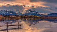 Winter en zonsopkomst over de Hopfensee, bij Hopfen am See met het Karwendelgebergte in de achtergrond, gelegen nabij Füssen, in de Allgäu, in Beieren, zuid Duitsland.