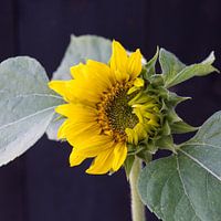 De koningin onder de bloemen ontwaakt. Een foto van een zonnebloem, half open.