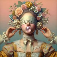 Een surrealistisch portret in barokstijl, kleurrijke pasteltinten en zacht getinte bloemen