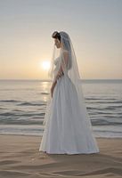 Dit kunstwerk, getiteld "Horizon Bride", vangt een betoverend moment waarin traditionele romantiek en moderne technologie samensmelten tegen de achtergrond van een serene zonsondergang aan het strand. De foto toont een vrouw gekleed in een elegante, vloeiende bruidsjurk. Haar sluier, subtiel meegenomen door de zeebries, creëert een etherische gloed rond haar silhouet, wat bijdraagt aan de dromerige sfeer van het stuk. Opvallend is de onconventionele toevoeging van een pilotenbril die stevig op haar hoofd rust, wat een eigentijds en speels contrast vormt met haar traditionele kleding.