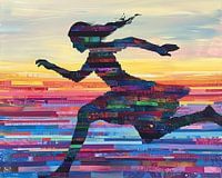 Horizon Leap - Dit is een schilderij van een vrouw in volle vaart — een silhouette van een springende of rennende figuur die het doek doorsnijdt als een scherpe beweging tegen een brede hemel. De kunstenaar koos voor de werking van een uitgesneden silhouet: geen gelaat, geen details, enkel de contouren van armen, benen en losgeblazen haar. Binnen die contouren zie je het echte spektakel: horizontale stroken kleur en textuur die samen het lichaam vormen. Daardoor lees je meteen: dit is een vrouw schilderij waarin beweging en gelaagdheid samenkomen, niet door lijnen maar door banen van kleur die elkaar overlappen. Het contrast tussen de statische horizontale banden en het dynamische profiel van de vrouw maakt het beeld spannend en helder tegelijk.
