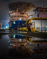 Offshore schip Horizon Star in de Merwehaven in Rotterdam 's nachts. Mooie reflectie in de regenplassen op de kade.