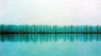 Dit werk presenteert een intrigerende, minimalistische interpretatie van een schemerlandschap dat wordt gedomineerd door perfecte symmetrie en een opvallend kleurenpalet. De compositie wordt verdeeld door een scherpe horizontale lijn in het midden, waarlangs een rij kale bomen weerspiegeld wordt in een onberispelijk stilstaand…